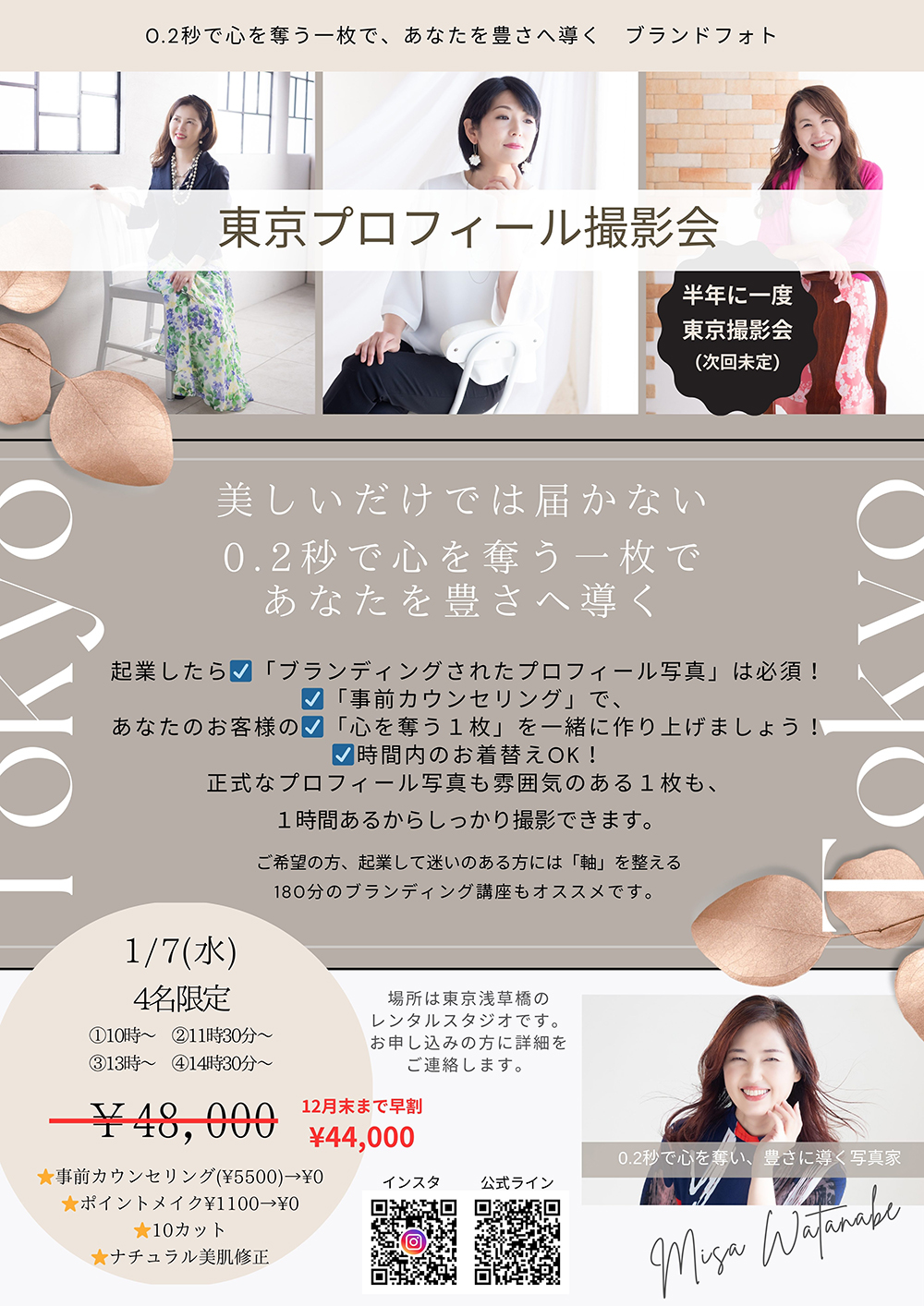 <お申し込み後に届くメール内容> (こちらにも添付しておきますので、ご確認ください) ① カウンセリングシート https://forms.gle/p8Jg7EPN8MRMqQGv5 ご入力をお願いいたします。 ※Zoomカウンセリング希望日の 前日まで にご提出ください。 ② Zoomカウンセリングの日程選択 事前のZoomカウンセリングをご希望の方は、 下記リンクより日時をお選びください。 https://resast.jp/pc_reserves_v3/course/42544?course_id=MmJmYzAzY2Y5O ※ご希望日は できるだけ早めに お選びください。 撮影直前になると、渡辺は出張に出ており、 カウンセリングが難しい場合がございます。 |