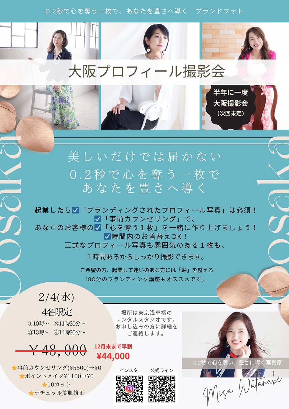 <お申し込み後に届くメール内容> (こちらにも添付しておきますので、ご確認ください) ① カウンセリングシート https://forms.gle/p8Jg7EPN8MRMqQGv5 ご入力をお願いいたします。 ※Zoomカウンセリング希望日の 前日まで にご提出ください。 ② Zoomカウンセリングの日程選択 事前のZoomカウンセリングをご希望の方は、 下記リンクより日時をお選びください。 https://resast.jp/pc_reserves_v3/course/42544?course_id=MmJmYzAzY2Y5O ※ご希望日は できるだけ早めに お選びください。 撮影直前になると、渡辺は出張に出ており、 カウンセリングが難しい場合がございます。 |